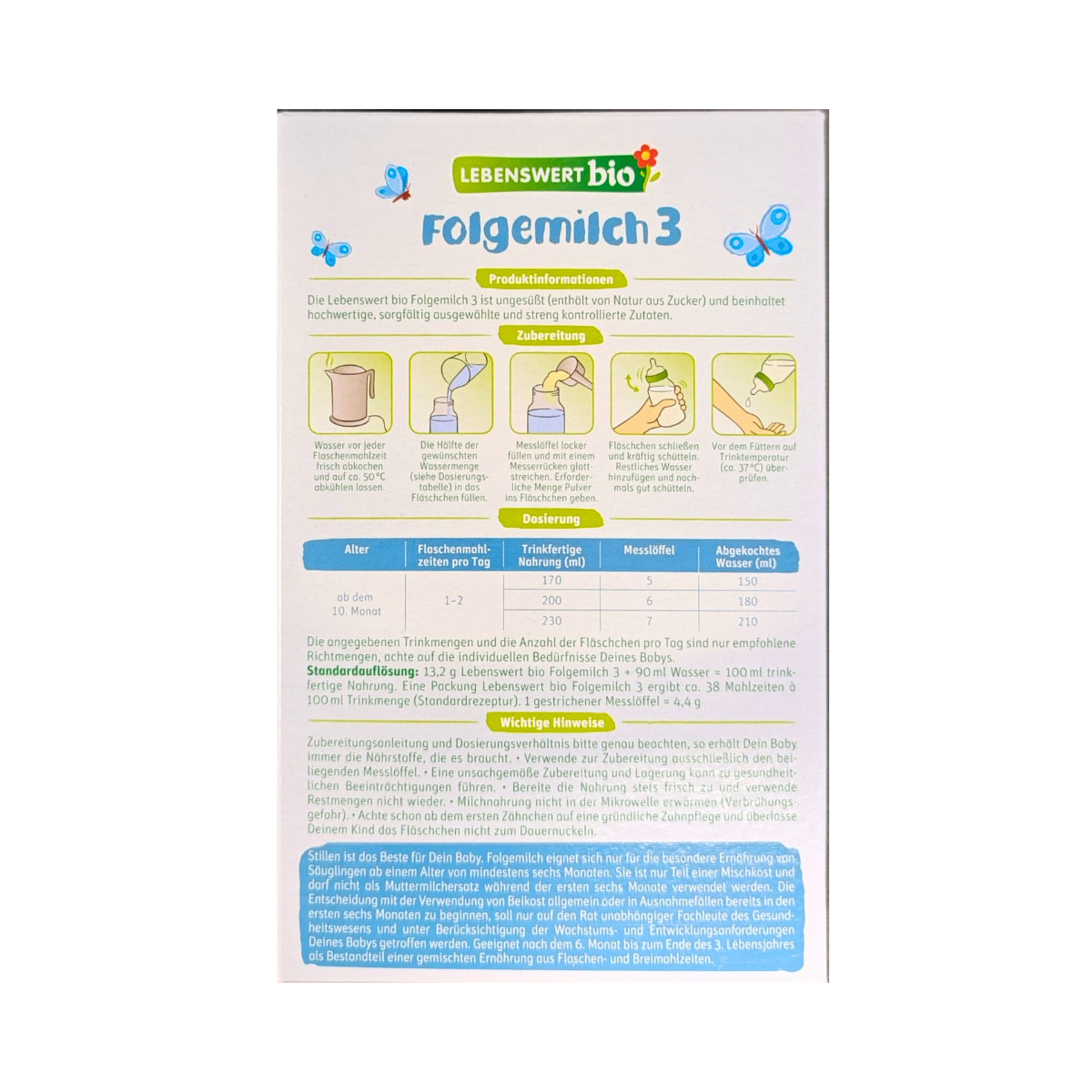 Lebenswert Organic Stage 3 preparation guide is located on the product page and on TheMilkyBox.com complete Formula Prep Page.